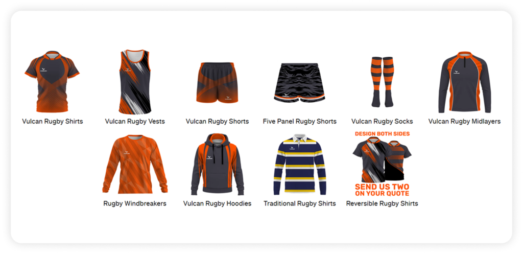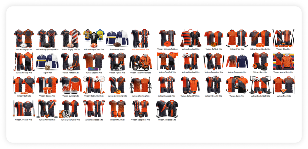 We offer a wide range of sports, each with its own specialist kit options, cuts, and design features.
