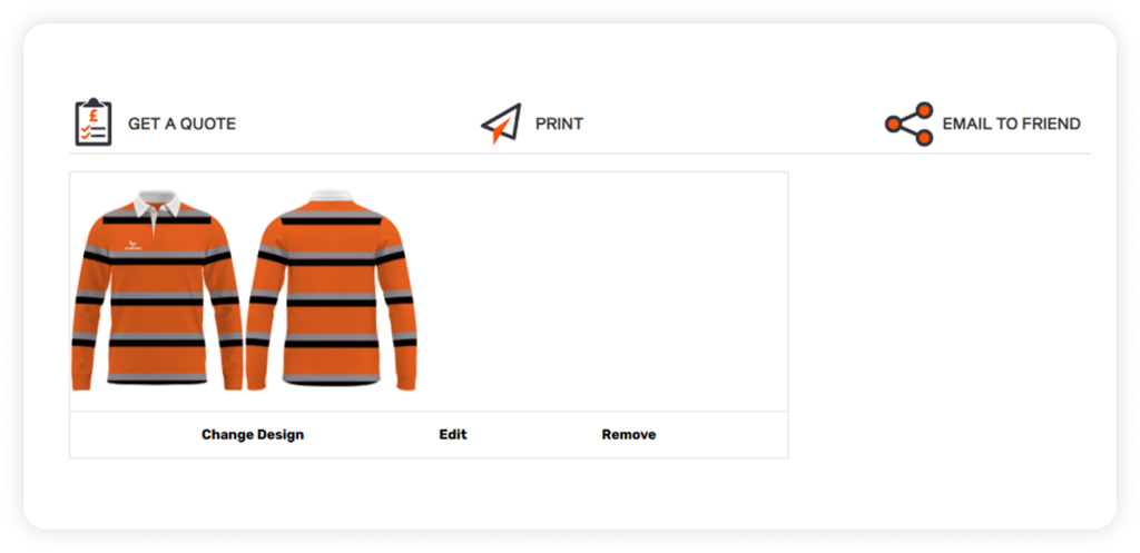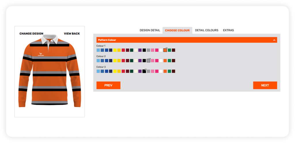 Use the colour picker to select your primary, secondary, and trim colours. You’ll see your choices update live on the shirt so you can instantly see how everything looks together.