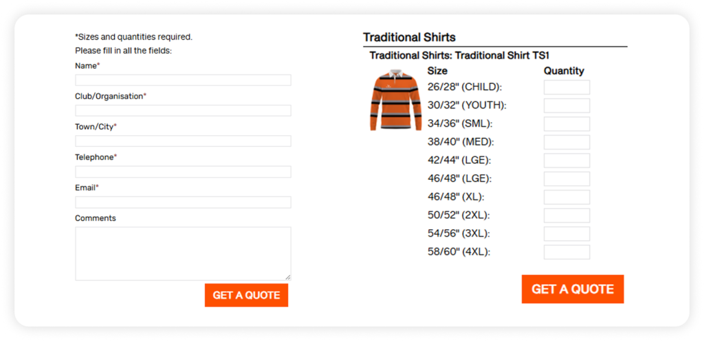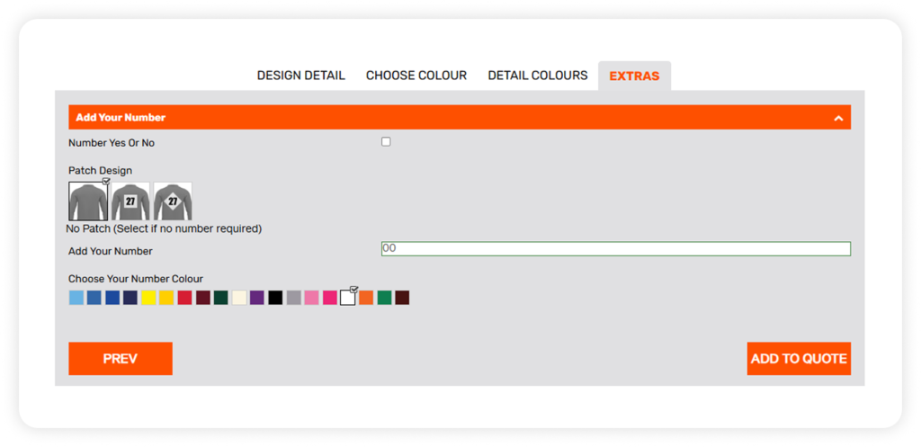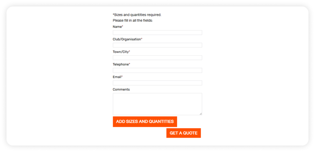 Don’t worry if you can’t see options for logos, sponsors, or embroidery at this stage. You’ll be able to add all of these later in Step Seven, using the comments section when you enter your contact details. This is where you can tell us about club crests, sponsors, names, numbers, and any other custom requests.